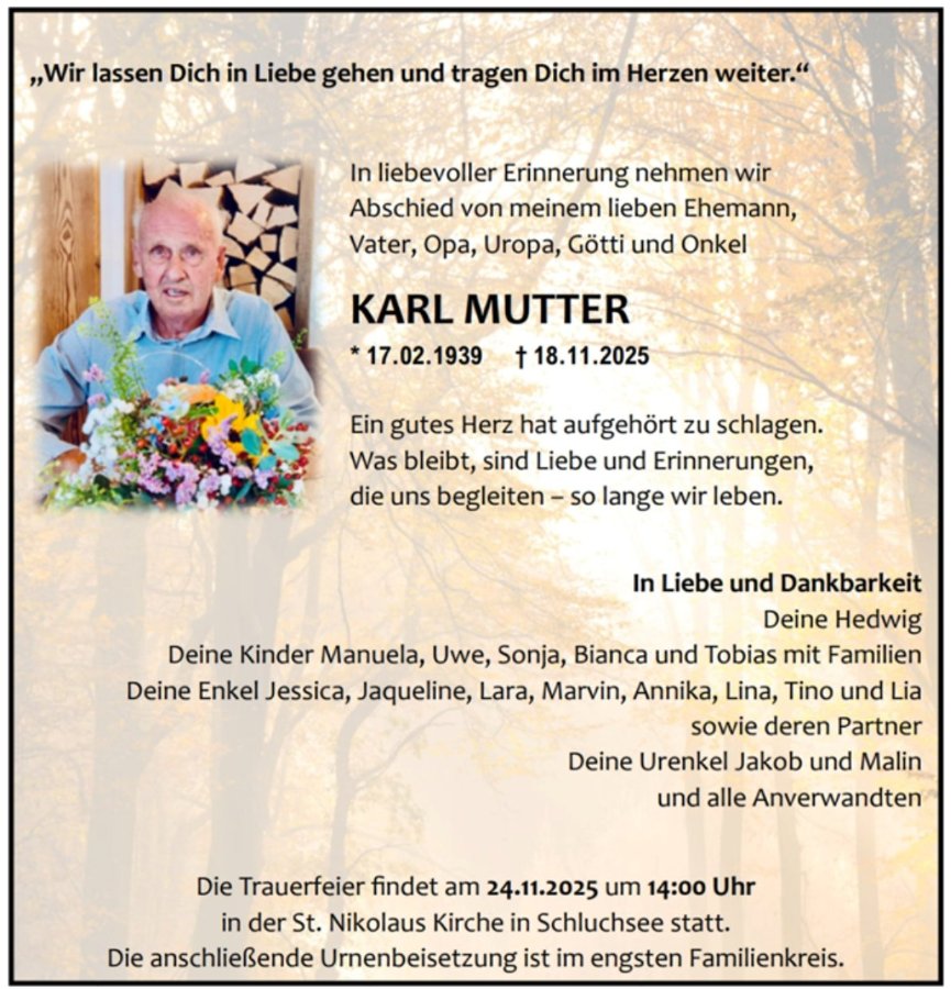 wir wünschen Ihnen von Herzen viel Kraft, dass Sie Menschen um sich haben, die Ihnen in dieser schweren Zeit beistehen und Halt geben. Zusätzlich können Sie auf dieser Gedenkseite Erinnerungen teilen und so das Andenken gemeinsam wachhalten.